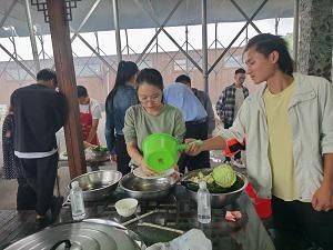 農(nóng)家柴火土灶對90后們更是一場考驗,隨機分成3組,各小組成員分工合作,生火、洗菜、切菜、掌勺.....隊友們一起商討配菜、生火技巧、切菜形狀,實在動不了手的隊友就剝蒜、搬柴、洗碗。